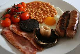 7. Take warmed plates out of the oven and arrange sausauges, bacon, black pudding and tomatoes onto plates.